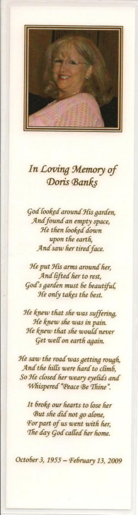 Doris Banks, age 53 of Grayson, passed away Friday, February 13, 2009. She is survived by her husband, Tony Banks, daughter & son-in-law, Cammie & Bryan Johnson, son, Clint Banks and Angie Reeves, four grandchildren, Mckenzie, Mallory, Shelbie, and Caleb, two sisters, Nancy and Mary, two brothers, Lee & Mike, several nieces and nephews, and numerous biker friends.