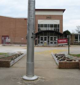 Front of the school (gym area is behind this wall). Main entrance is located to the right of this photo.